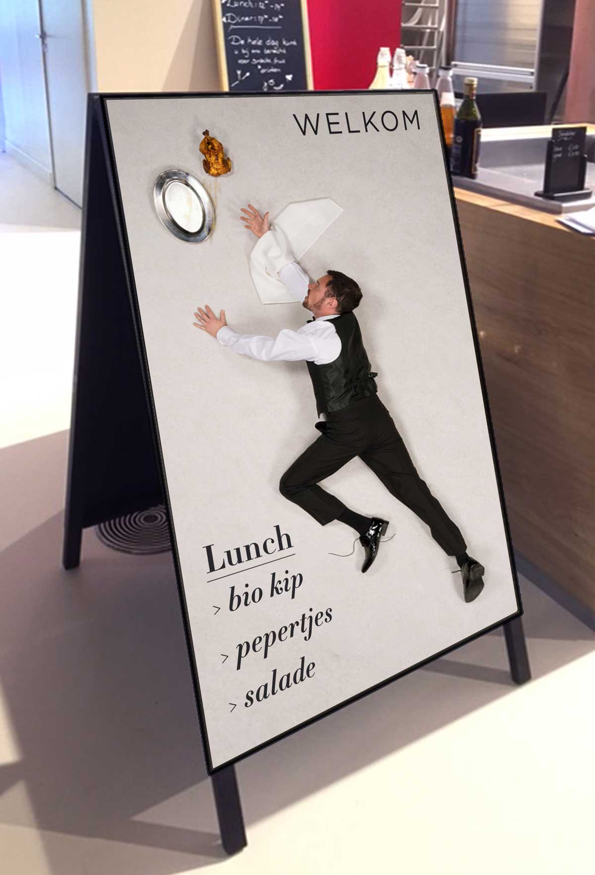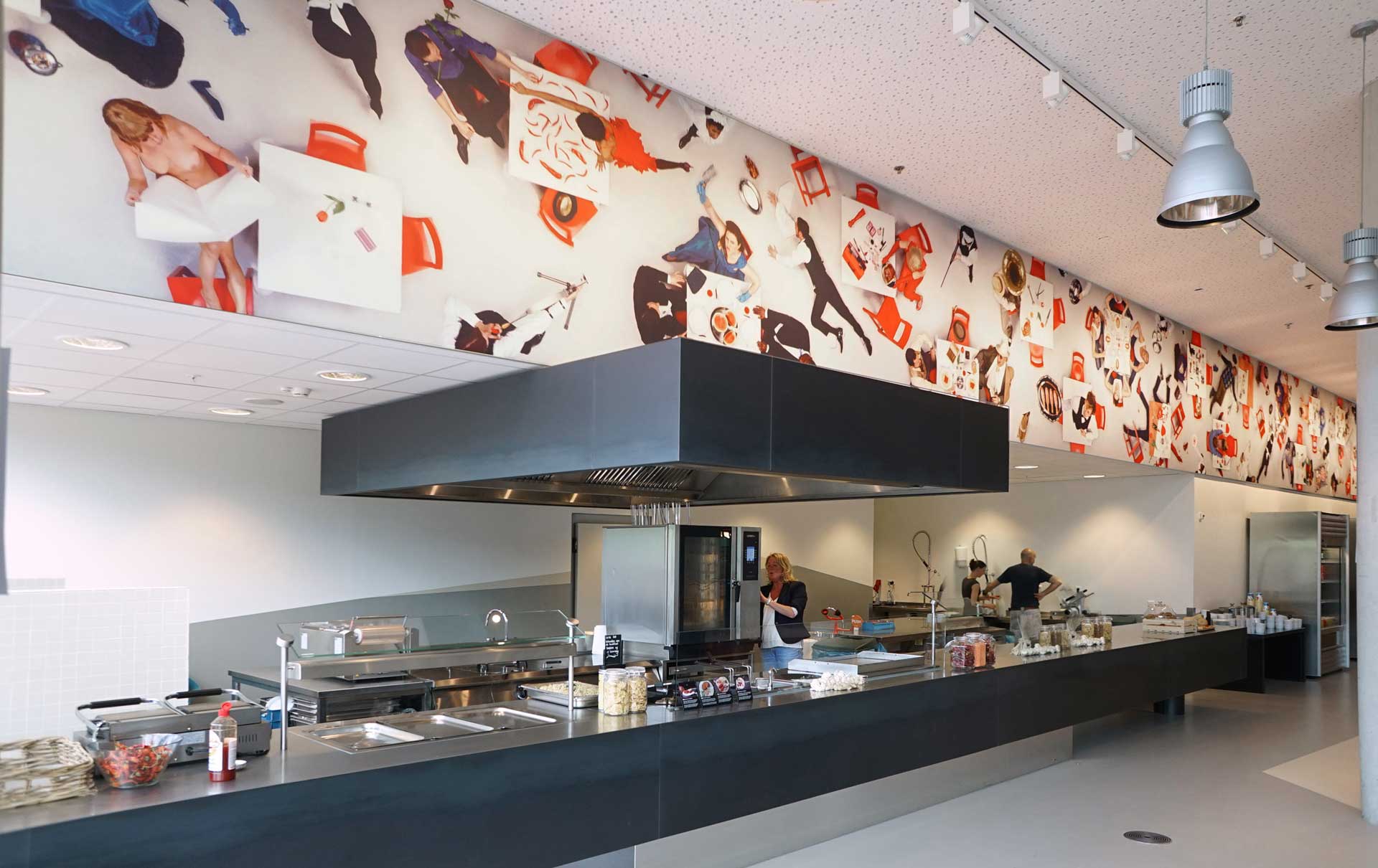 This narrative wall was created for a newly built restaurant used by public broadcaster VPRO. The design is based on a film storyboard and depicts fictional scenes - set in an imaginary restaurant - which are linked to TV and drama productions. We concentrated on producing a design to suit the space rather than dominating it. The chosen perspective (top view) produces an almost abstract pattern when seen from a distance. Closer consideration reveals realistic scenes with unexpected details. The bird’s eye view is an essential part of this idea as it forces the observer to interpret the image in a different way.