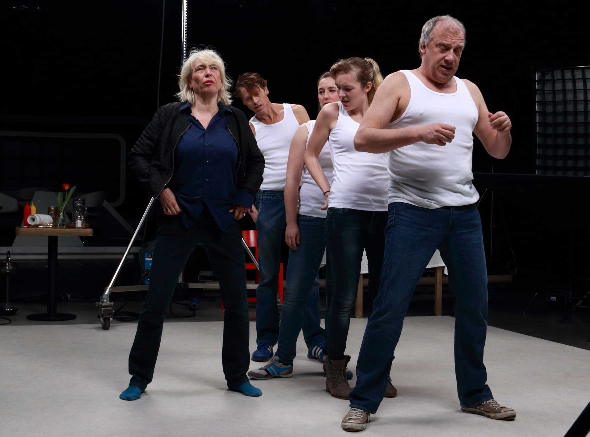 Making-of images during the studio shoot. Yvonne directs the sausage eaters: act it out!